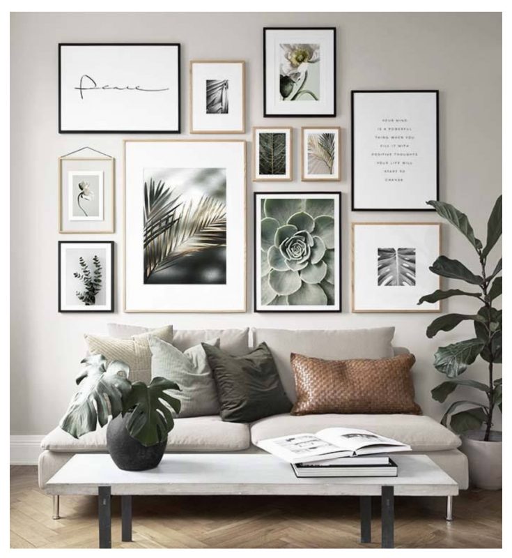 Vary the Size, Texture and Tone – Unless installing a grid, it is best to vary the look of the frames as opposed to making them all match. This could mean mixing and matching different finishes, colors, frame sizes and profiles. If you choose to stick to one color, you may want to add interest by mixing different profiles and finishes, such as glossy vs. matte or smooth vs. textured.