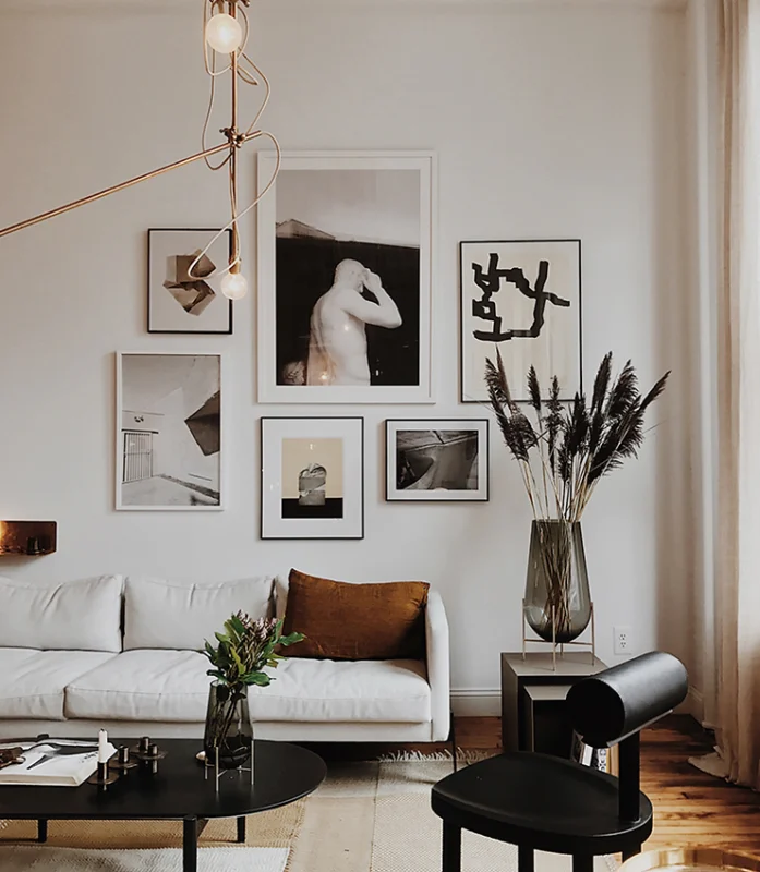 Vary the Size, Texture and Tone – Unless installing a grid, it is best to vary the look of the frames as opposed to making them all match. This could mean mixing and matching different finishes, colors, frame sizes and profiles. If you choose to stick to one color, you may want to add interest by mixing different profiles and finishes, such as glossy vs. matte or smooth vs. textured.