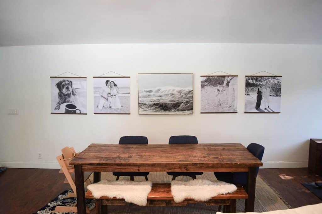 We decided to go with custom prints from Photowall. We got them just a couple inches shorter than the main photo (ours measure 28×28 in) and we decided to go with these hanging frames to bring in the wood from the centerpiece frame, our table, and the console in that room. This way the centerpiece really stood out, but everything felt cohesive with black, white, and wood.