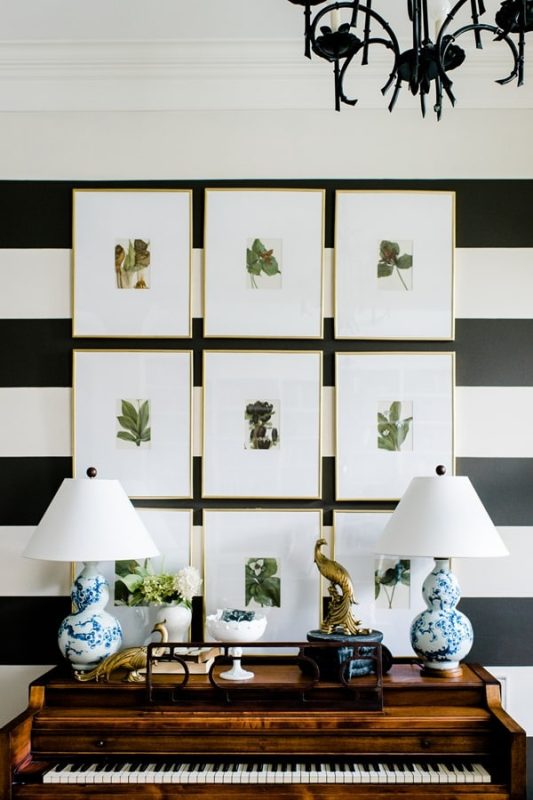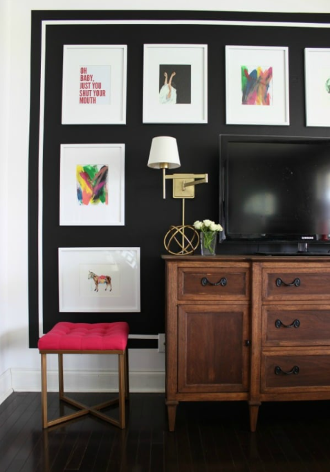 There are so many ways to go about creating a gallery wall, but one way to achieve a uniform look is to use large, oversized frames in the same size. You can add a variety of prints or art, but keep it all looking put together with matching frames.