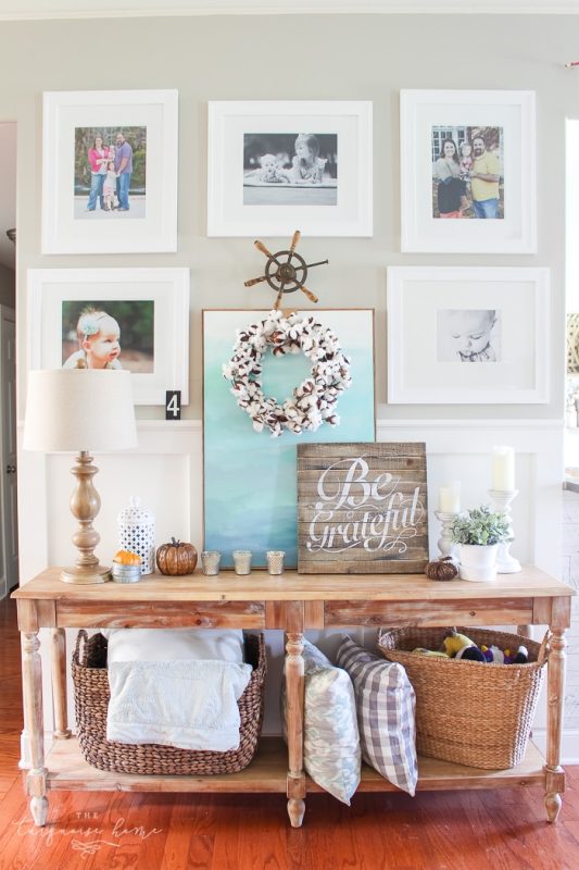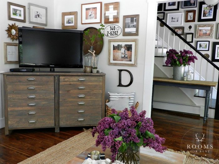 The eclectic gallery wall is one of my favorites! The idea is to take a bunch of different decor items and frames to create a focal point in your room. I love how Bre from Rooms for Rent mixes in frames of all kinds and other non-frame items like letters, antiques and trays. Keeping everything in the same farmhouse style is what unifies her space.
