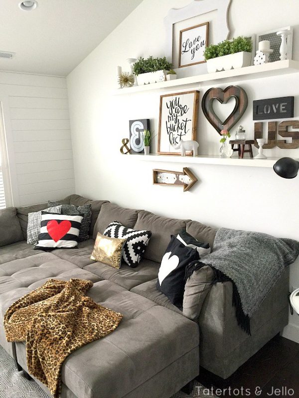 A gallery wall with shelves is not the same thing as floating shelves in a wall. Well, maybe they are close cousins, but I think there’s a slight difference. I think that gallery walls not only have items resting on the shelves, but have items hanging on the walls between the shelves and below, too. The little arrow below the bottom shelf is the perfect touch!