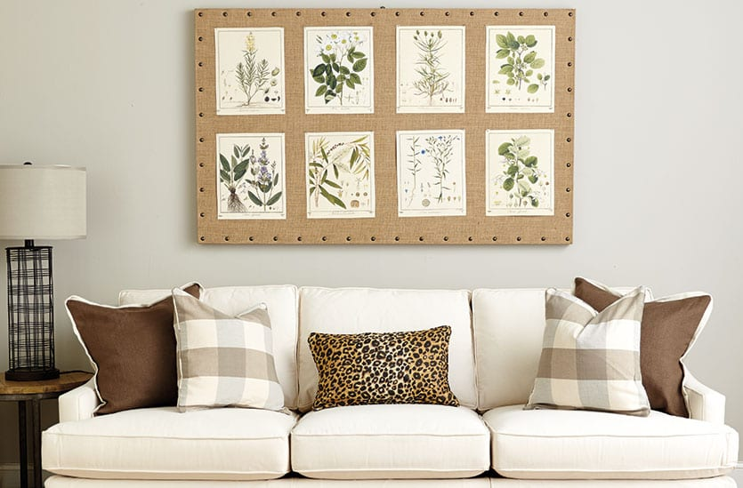 - First, hang your piece(s) so that nothing goes below about 10 inches from the back of the couch.