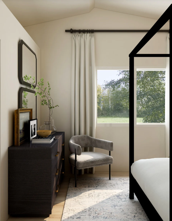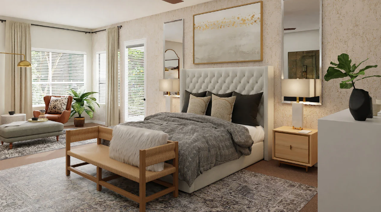 For traditional elegance, choose furniture with soft, feminine touches such as Victorian, even if that is not typically your style. The elegant curves and small details in traditional furniture instantly soften the feel of the room and add a layer of sophistication. Look for beds, accent chairs, and upholstered benches of that style, and pair with rich, dark woods and gold accents.