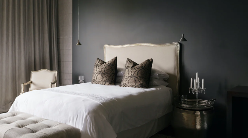 Moody dark wall colors like inky black, charcoal, burgundy and dark gray can set a sultry tone in the bedroom. Paired with Victorian furniture, candles, and lighter bedding, dark walls can make the room classically elegant.