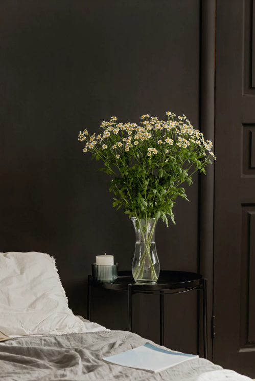 Dark walls make greens and whites pop. Decorate with deep green foliage and plants, white roses or other flowers, and light colored bedding.