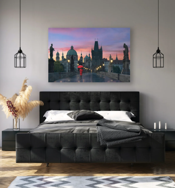 This bedroom painted a lighter shade of gray is paired with a charcoal black bed and furniture for lots of bold contrast. The artwork featuring a woman in red walking through the streets of a faraway country is full of mystery and romance. The power of art to create a romantic ambience is discussed next.