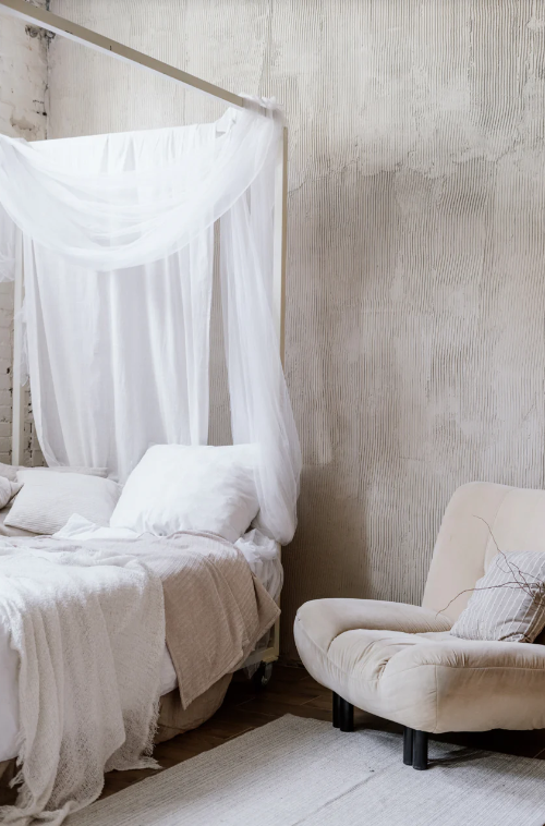 Create a canopy by draping sheer curtains over a four poster bed to create a romantic oasis in your bedroom.