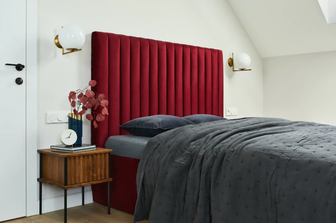 The classic deep red, rich wood tones and dark gray sets the tone in this romantic bedroom.