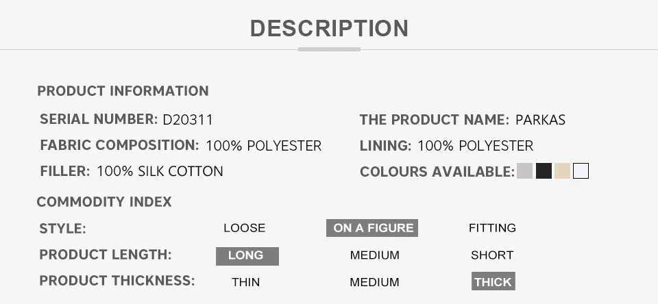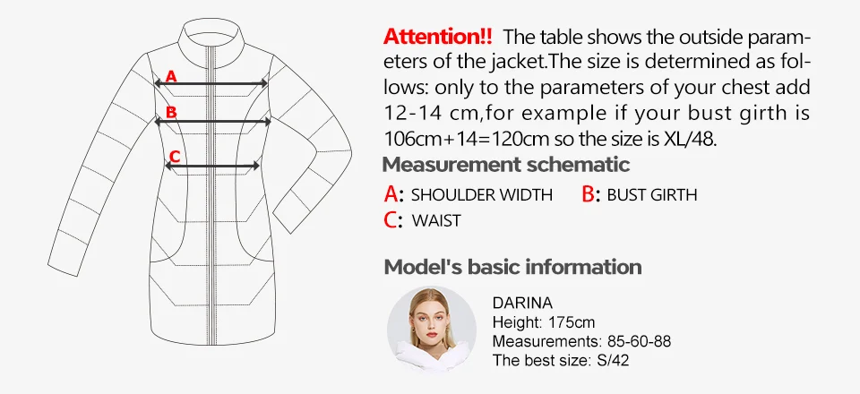Down jacket just otpad!!! Quality is very good factory sewing!! The size of xl-48 Russian is not small in size. On the parameters 98-80-100 everything came perfectly! Sleeve of good length. The length of the down jacket is up to the middle of the calf. The color is a little Milky. Thank you very much megofse!! Highly recommend!!! Courier brought straight to the door thanks for the service!!