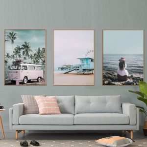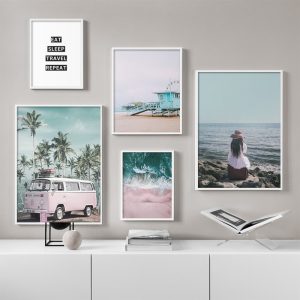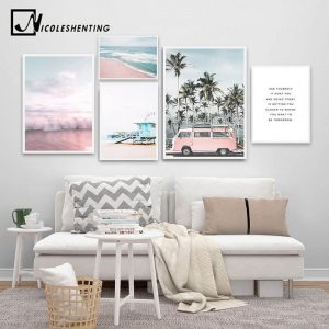 Ocean Landscape Canvas Poster Nordic Style Beach Pink Bus Wall Art Print Painting Decoration Picture Scandinavian Home Decor