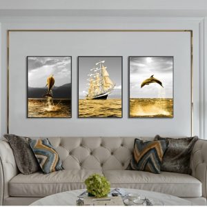 Ocean Landscape Sailing Boat Golden Ocean Life Dolphin Wall Art Canvas Posters and Prints Wall Art Picture for Living Room 2-42