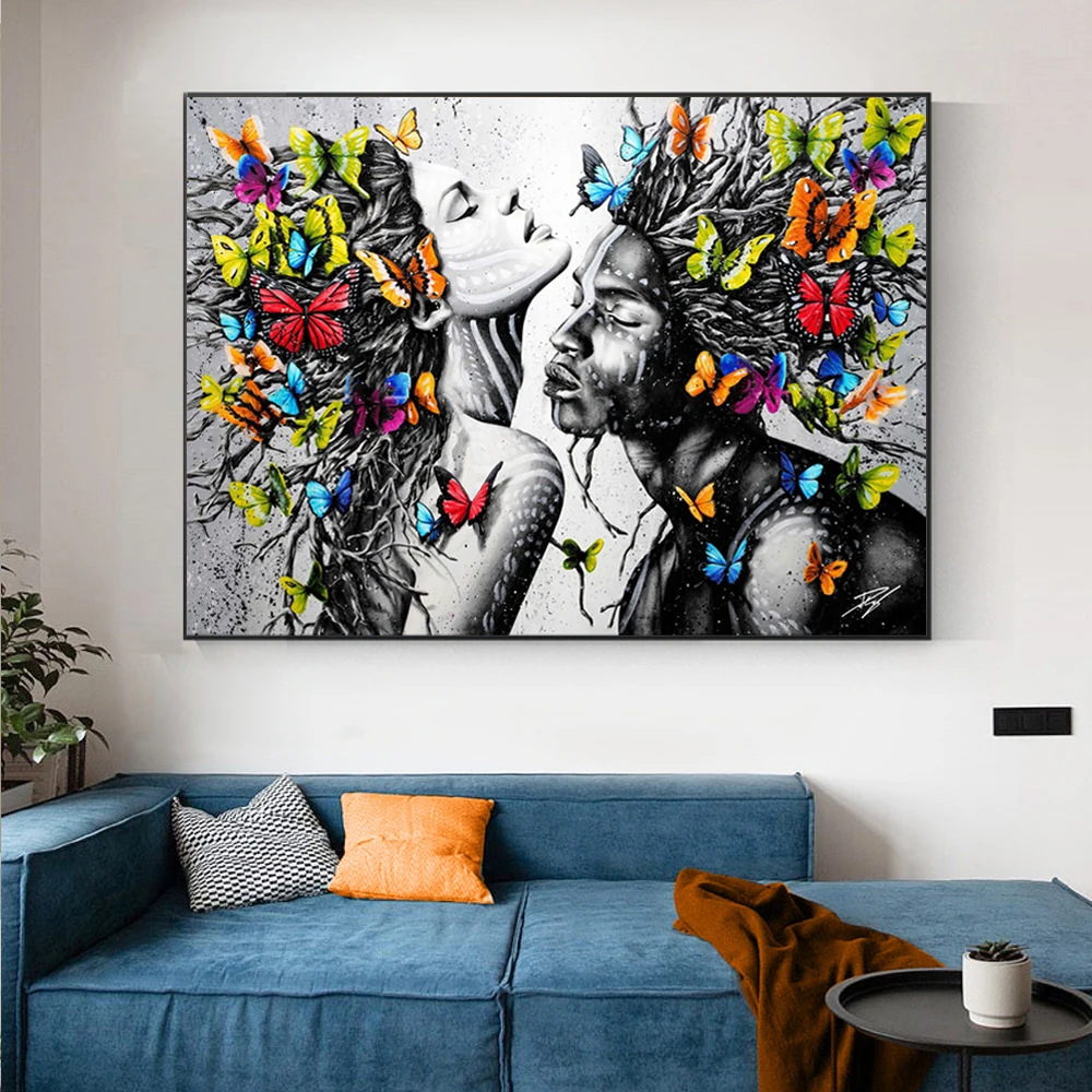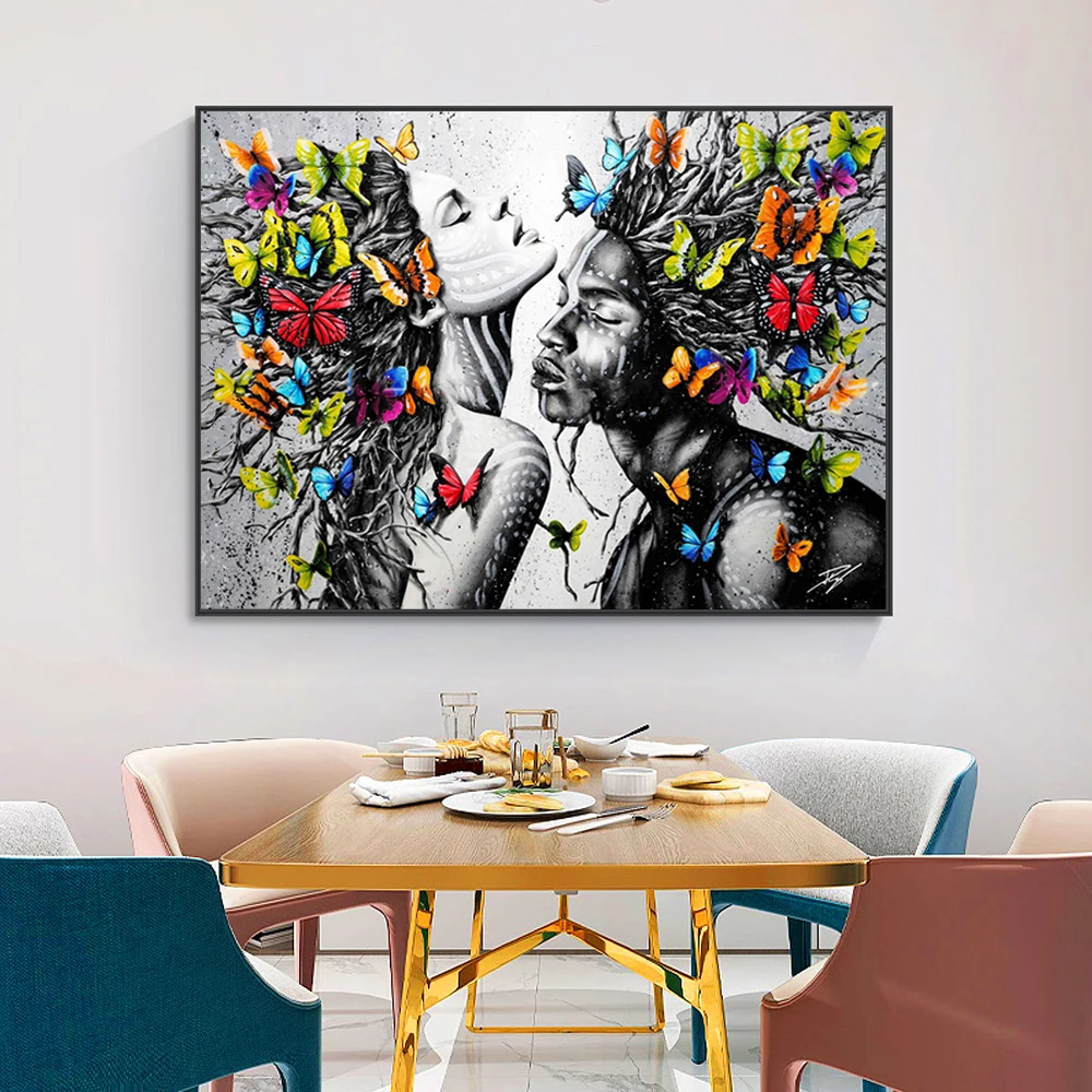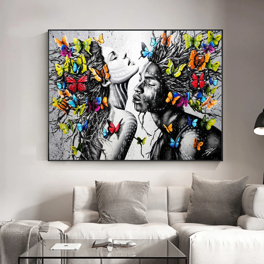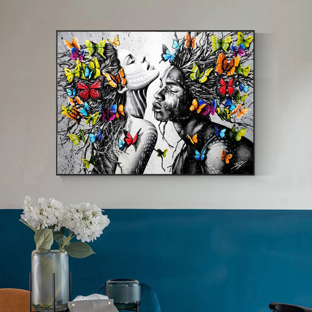 Abstract Figure Painting Black Naked Couple Colorful Butterfly Print Poster Canvas Wall Art Pictures for Living Room Home Decor