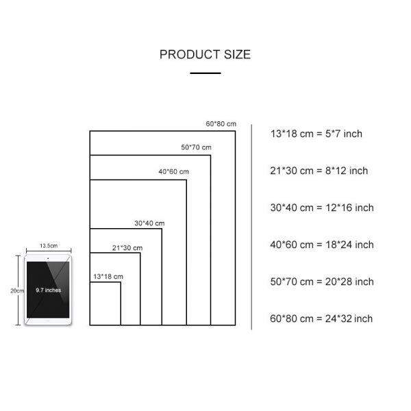 | Size (Inch) | 20x30cm no frame, 30x40cm no frame, 40x60cm no frame, 50x70cm no frame, 60x80cm no frame, 13x18cm no frame |
