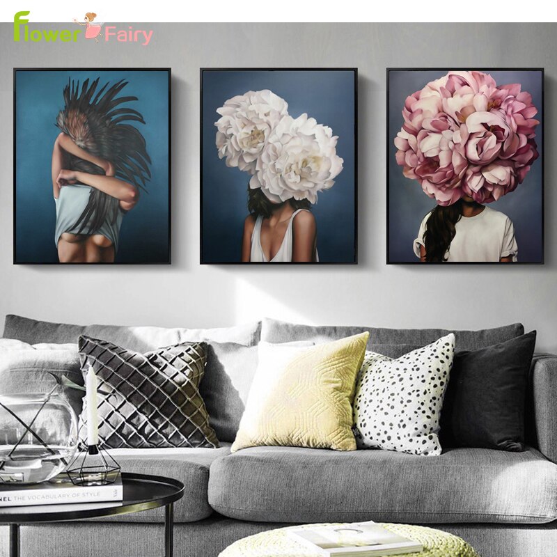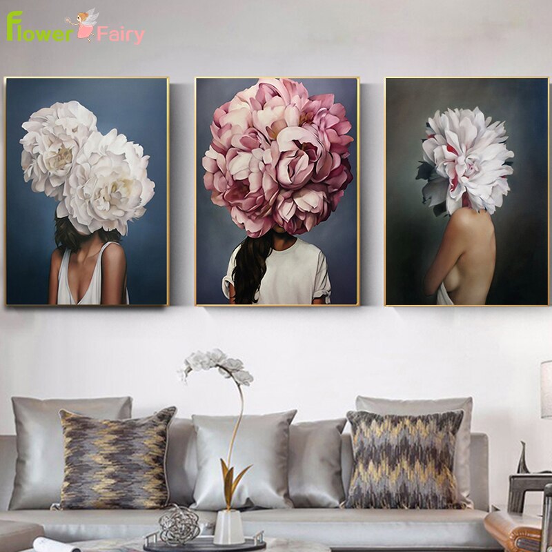 Abstract Peony Flowers Girl Nordic Poster Feather Wall Art Canvas Painting Print Modern Wall Pictures For Living Room Unframed