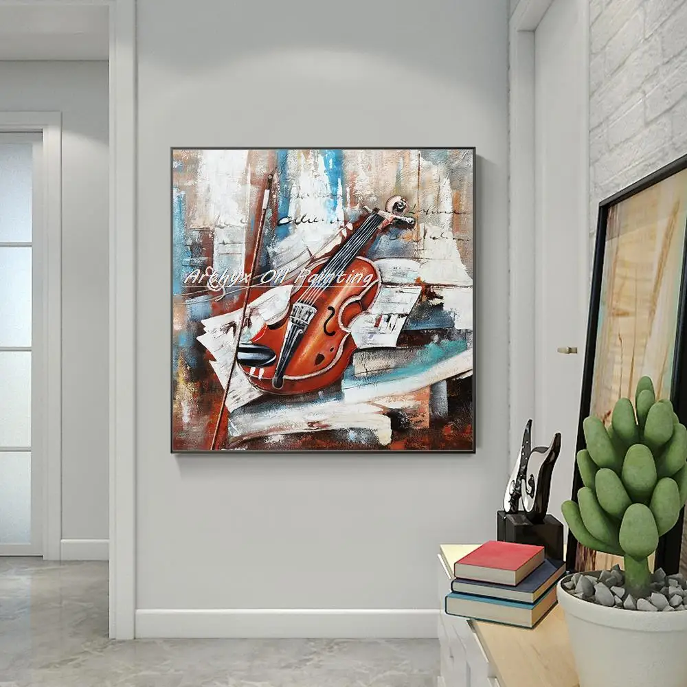 Arthyx Handpainted Musical Instruments Oil Painting On Canvas Modern Abstract Violin Wall Art Picture For Living Room Home Decor