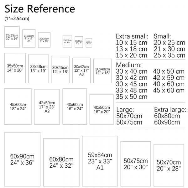 | Size (Inch) | 10x15cm NO Frame, 13x18cm NO Frame, A5 15x20cm NO Frame, 20x25cm NO Frame, A4 21x30cm NO Frame, 25x35cm NO Frame, 30x40cm NO Frame, A3 30x42cm NO Frame, 30x45cm NO Frame, 33x48cm NO Frame, 35x50cm NO Frame, 40x50cm NO Frame, 40x60cm NO Frame, A2 42x59cm NO Frame, 45x60cm NO Frame, 50x70cm NO Frame, 50x75cm NO Frame, 60x80cm NO Frame, A1 59x84cm NO Frame, 60x90cm NO Frame |
