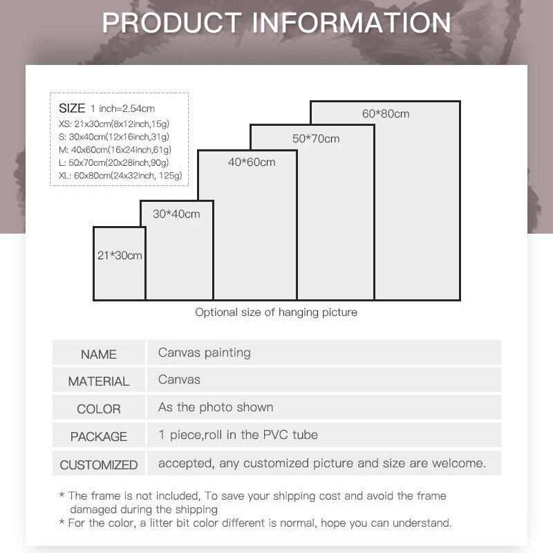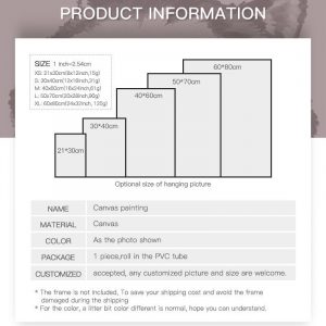 | Size (Inch) | 13X18CM No Frame, 15X20CM No Frame, 20x25CM No Frame, 21X30CM No Frame, 30x40CM No Frame, 40x60CM No Frame, 50x70CM No Frame, 60X80CM No Frame |