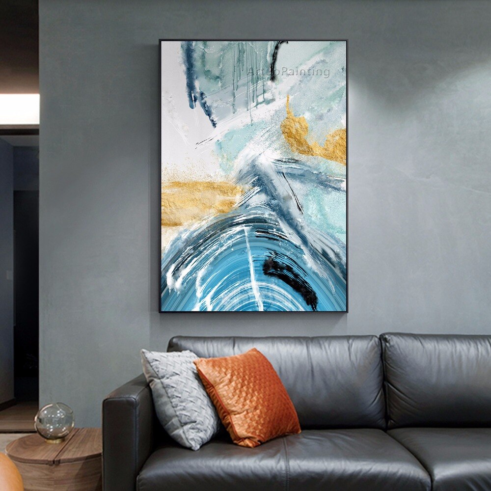 Blue Gold Geometric Morden Abstract Oil Painting on Canvas for Home office Decor Caudros Decor Wall Art Acrylic Pictures