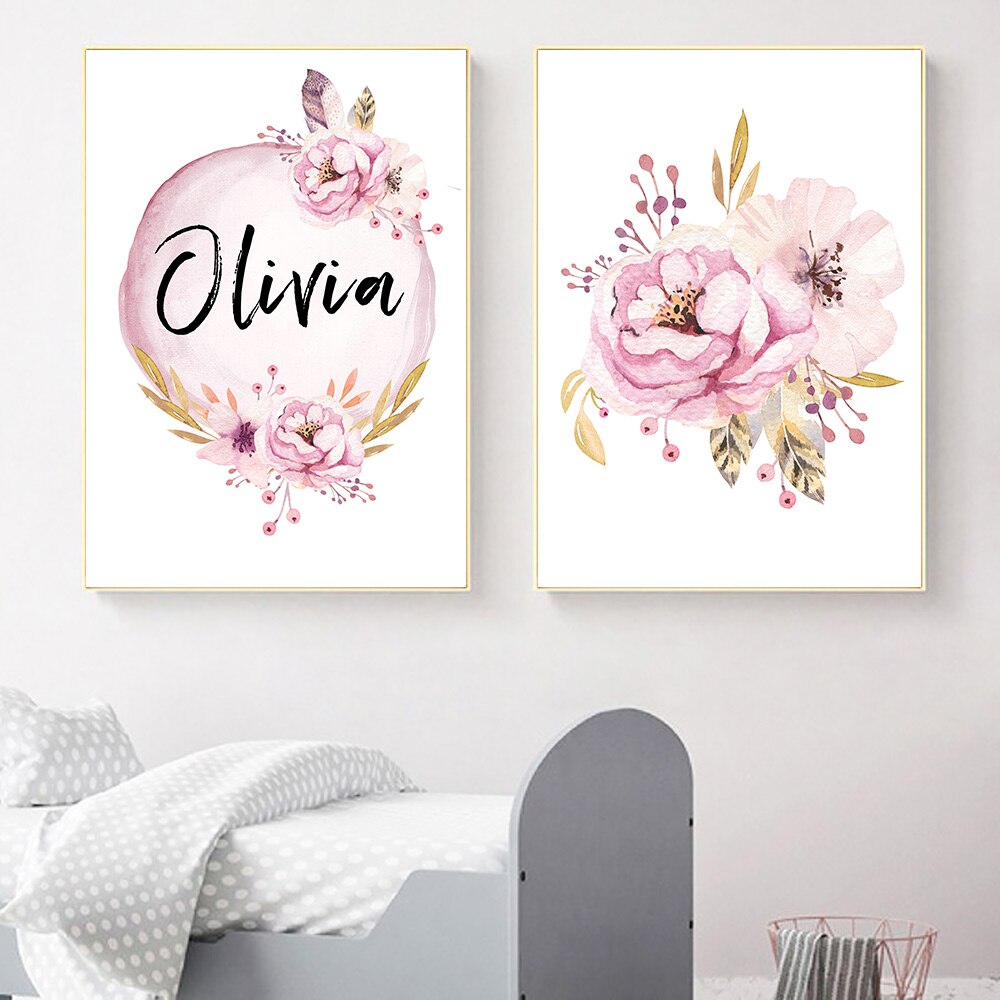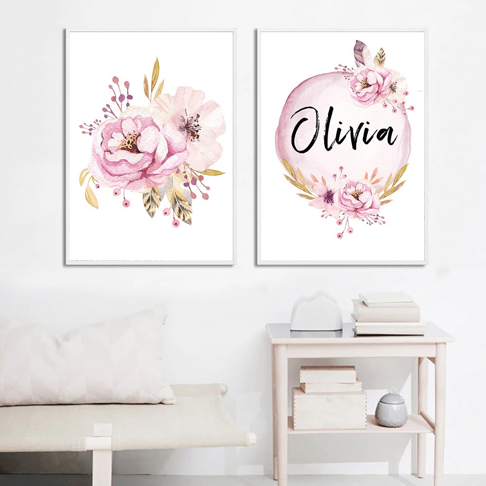 Custom Girl Name Baby Poster Peony Pictures Flowers Canvas Painting Wall Art Nursery Prints Wall Painting Kids Bedroom Decor