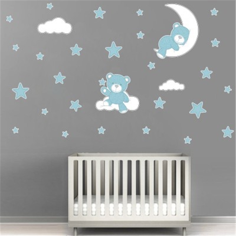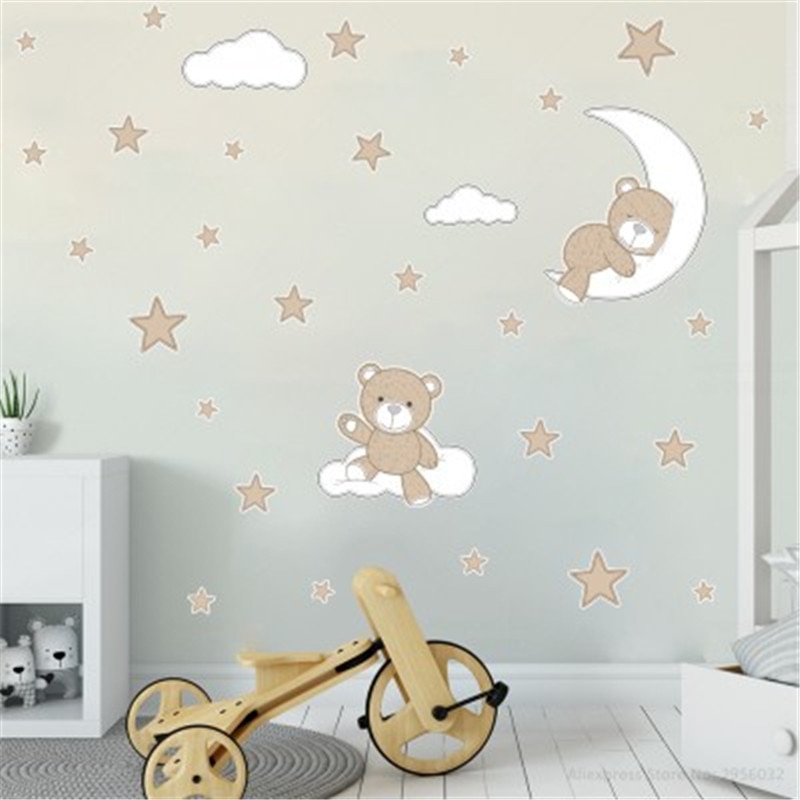 Cute Moon Stars Bear Wall Stickers For Kids Baby Room Home Nursery Art Decorative Sticker Children Bedroom Decals Murals Muraux