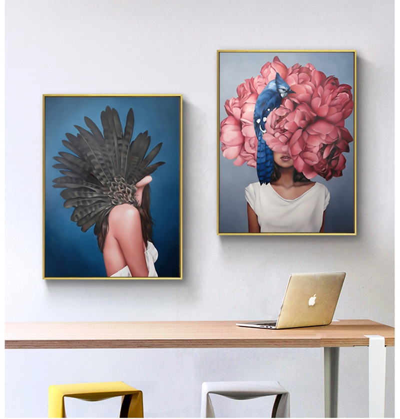 Flowers Feathers Woman Abstract Canvas Painting Wall Art Print Poster Picture Decorative Painting Living Room Home Decoration