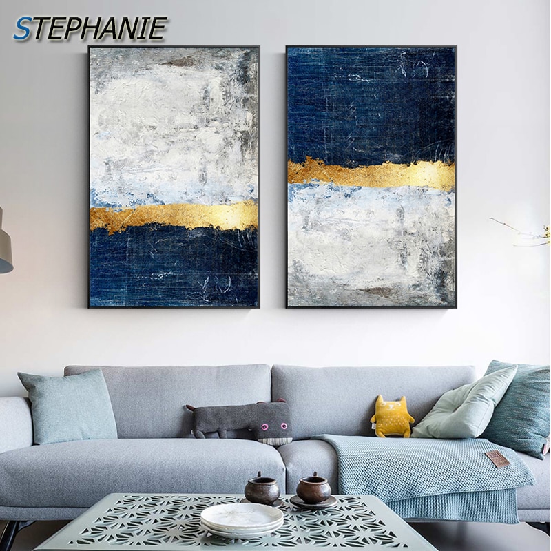 Modern Golden Wall Art Picture Abstract Gold Foil Block Painting Blue Poster Print for Living Room Navy Decor Big Size Tableaux