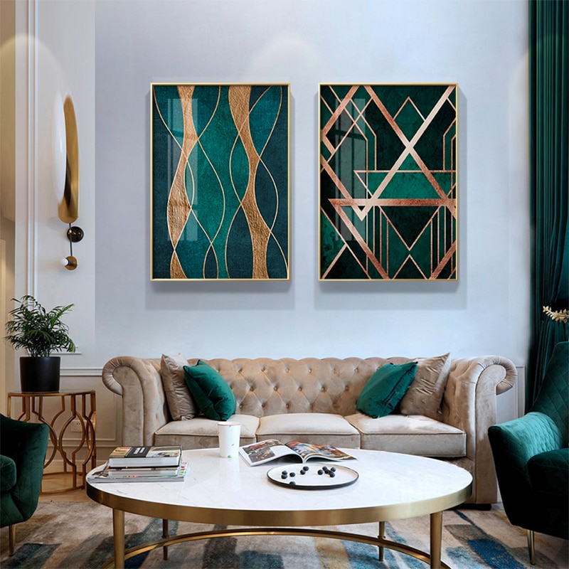 New Arrive Geometric Abstract Canvas Painting Light Luxury Colorful Gold Green Wall Art Poster Design For Living Room Home Decor