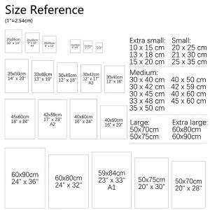 | Size (Inch) | 10x15cm NO Frame, 13x18cm NO Frame, A5 15x20cm NO Frame, A4 21x30cm NO Frame, 25x35cm NO Frame, 30x40cm NO Frame, A3 30x42cm NO Frame, 30x45cm NO Frame, 33x48cm NO Frame, 35x50cm NO Frame, 40x60cm NO Frame, A2 42x59cm NO Frame, 45x60cm NO Frame, 50x70cm NO Frame, 50x75cm NO Frame, 60x80cm NO Frame, A1 59x84cm NO Frame, 60x90cm NO Frame |