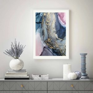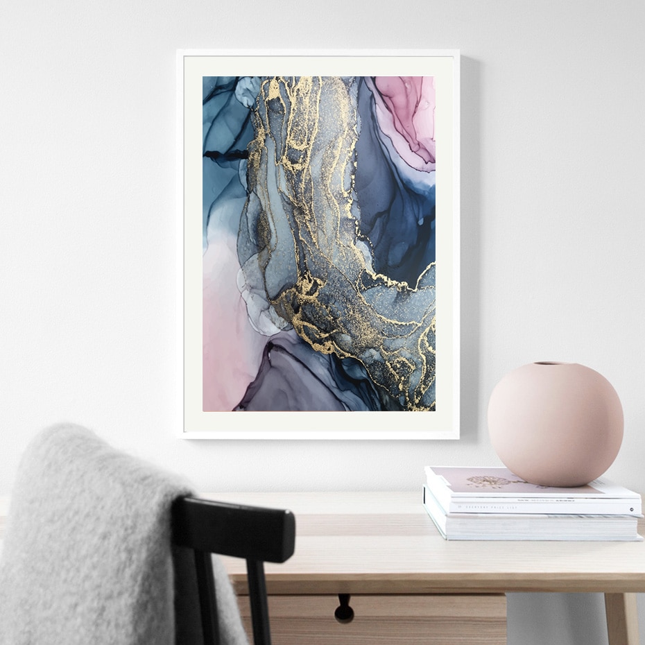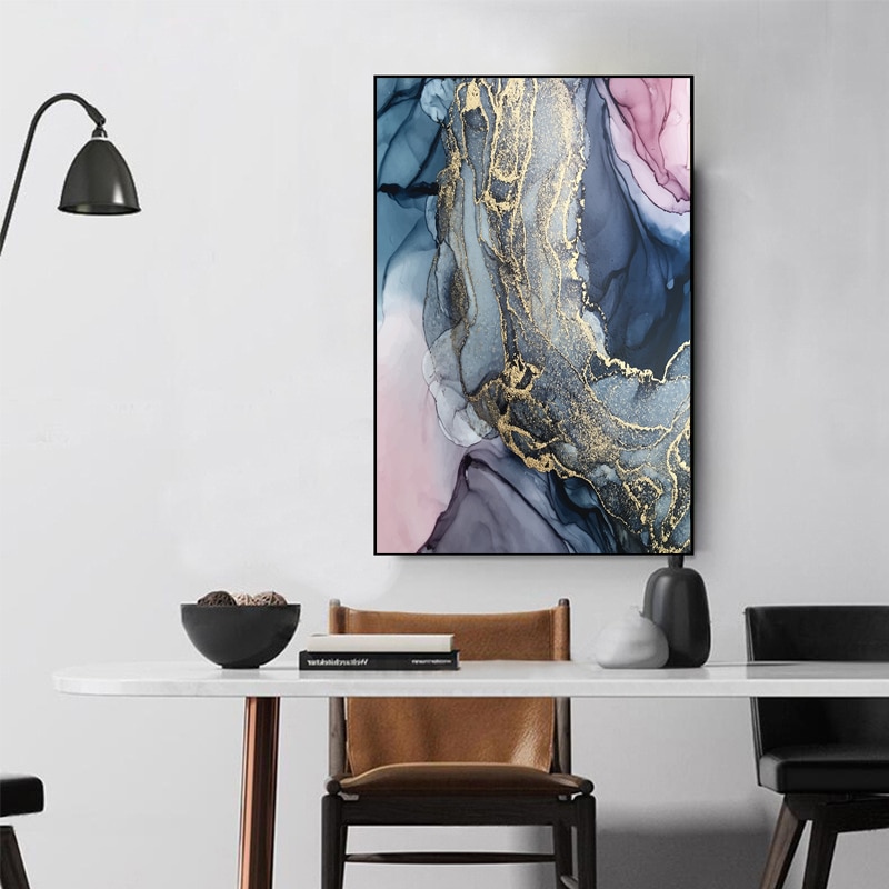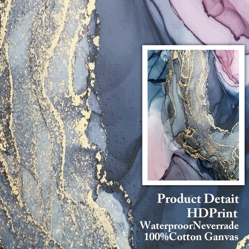Nordic Morden Abstract Pink-gray line Wall Art Canvas Painting Golden Blue smoke Art Poster Print Wall Picture for Living Room