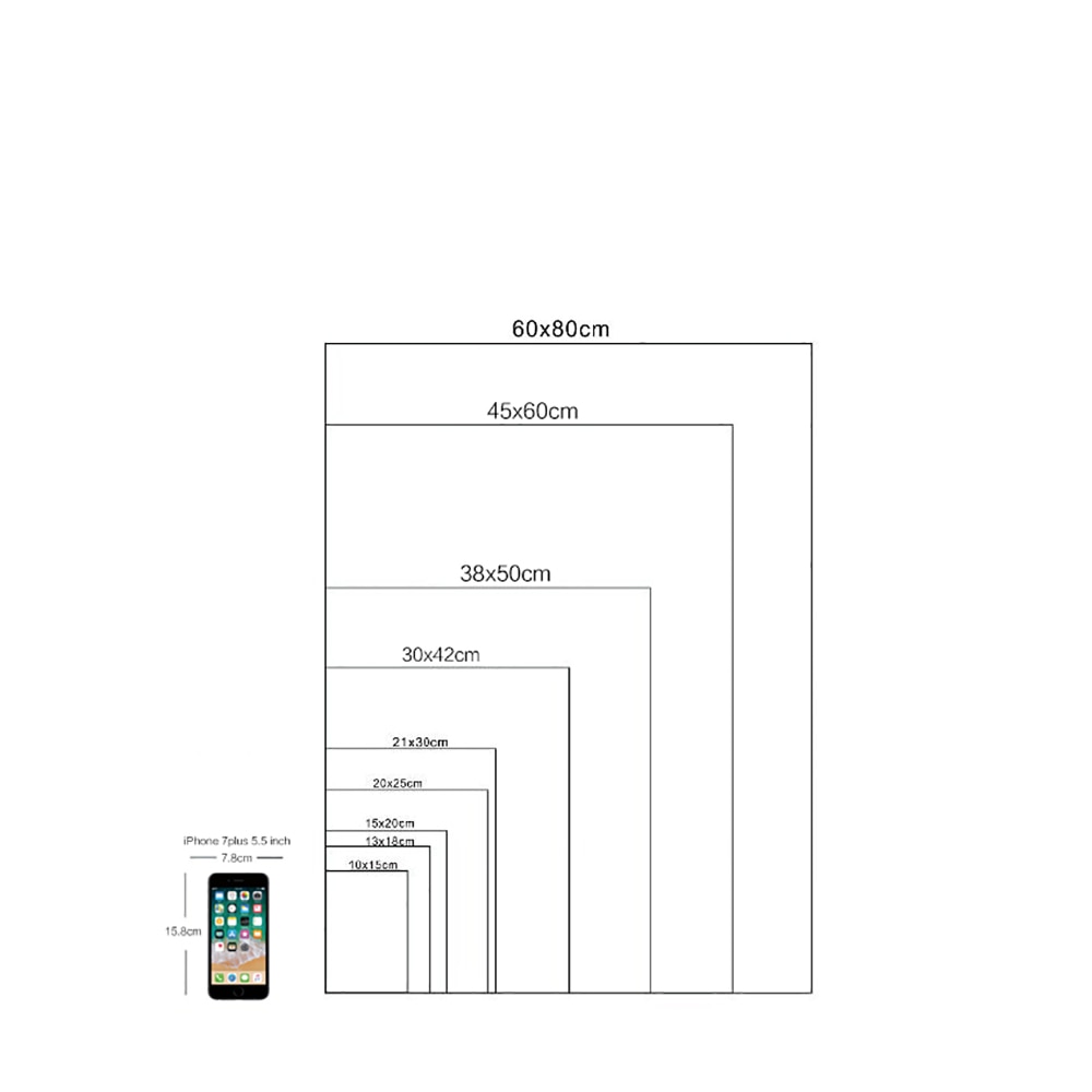 | Size (Inch) | 10x15cm No Frame, 13x18cm No Frame, 20x25cm No Frame, 21x30cm No Frame, 30x42cm No Frame, 38x50cm No Frame, 45x60cm No Frame, 60x80cm No Frame |