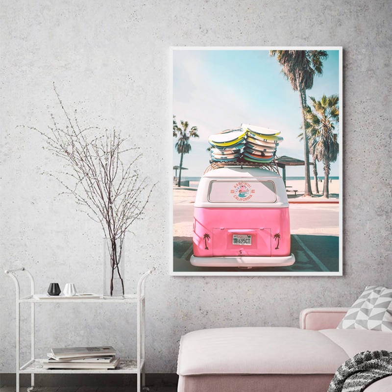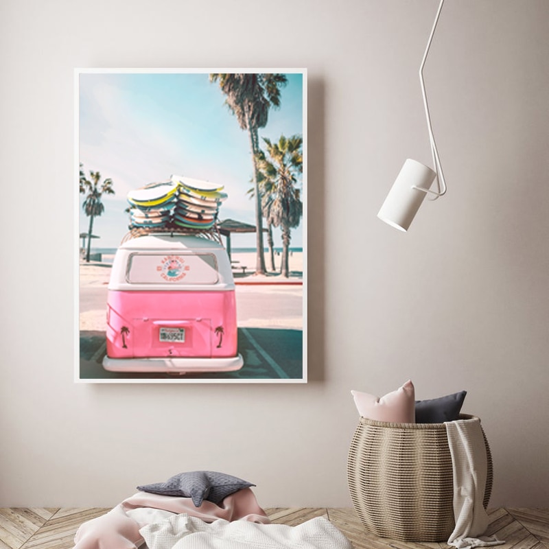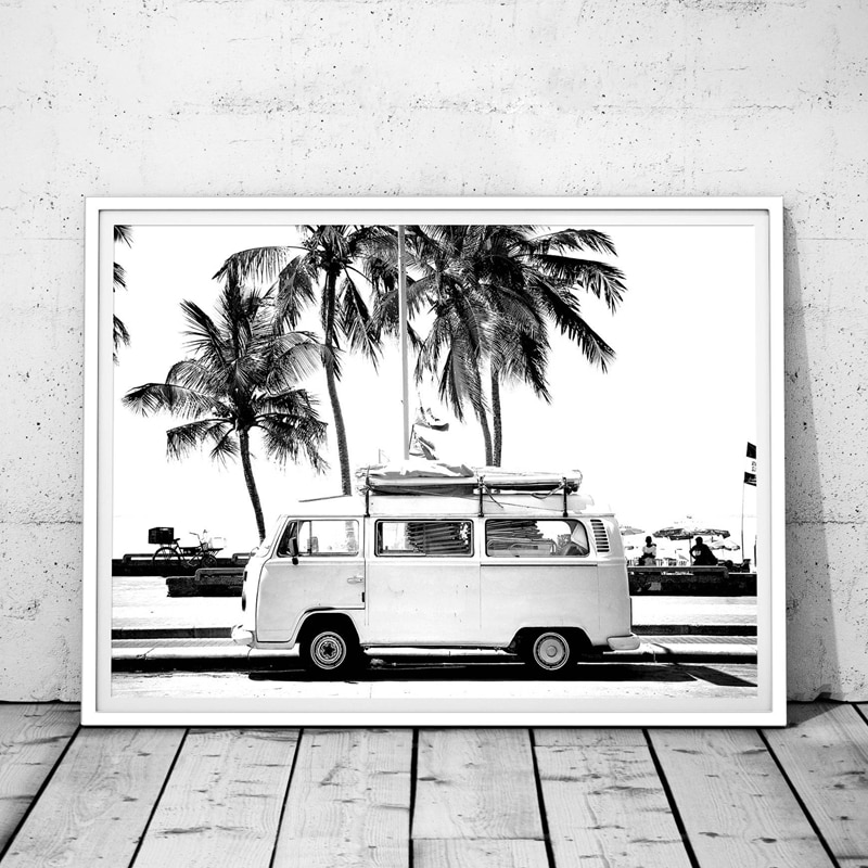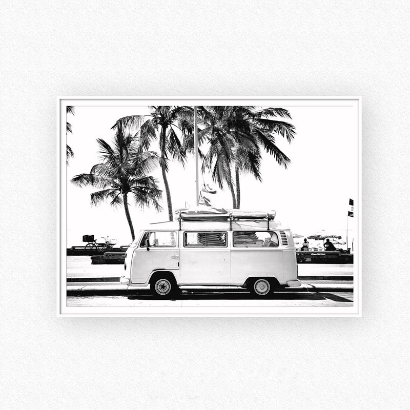 Vintage Coastal Photography Print Retro Bus Van Camper And Black Palm Tree Canvas Painting Wall Picture Coastal Art Decor