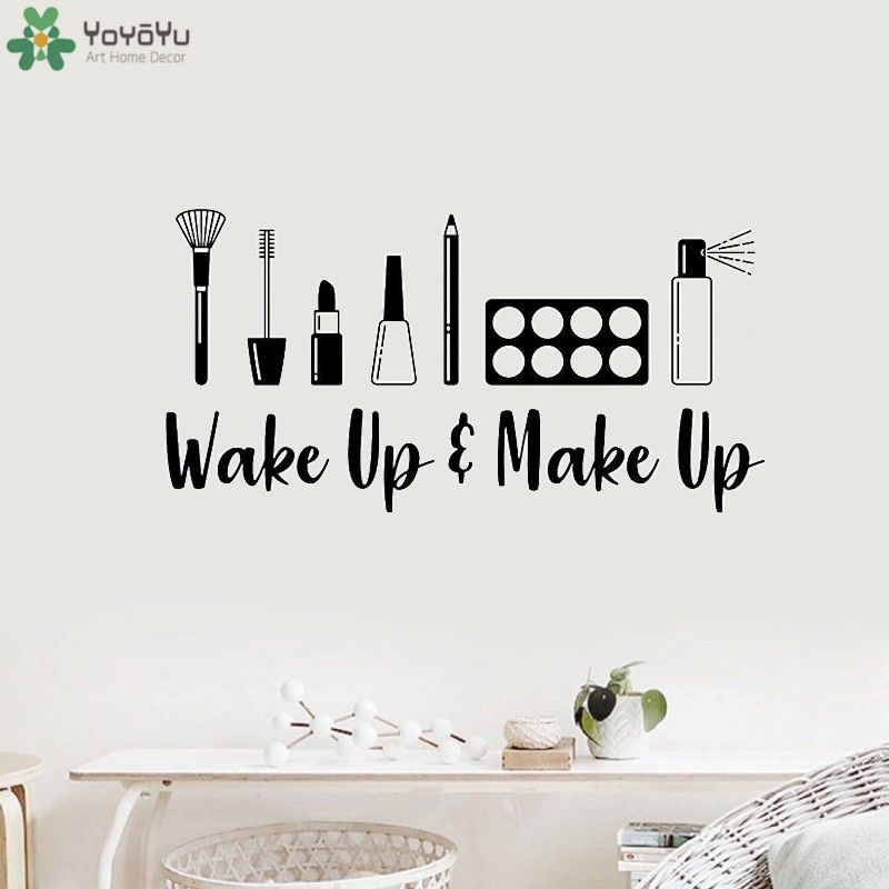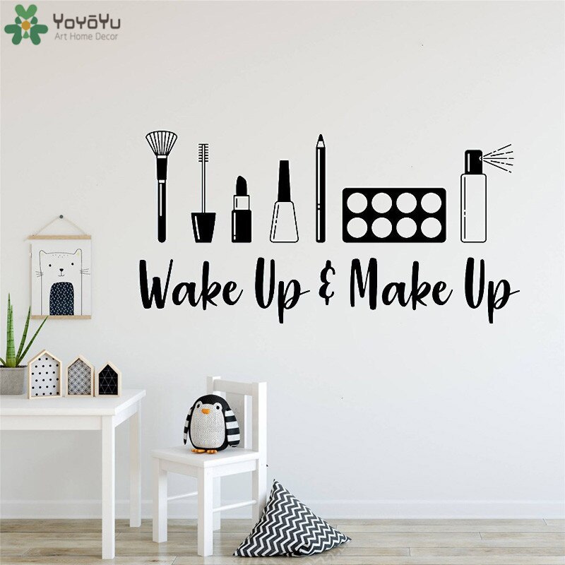 Wake Up And Make Up Stickers Vinyl Decal For Girls Room Bedroom Art Decoration Beauty Salon Wall Decals Delicate Makeup QQ40